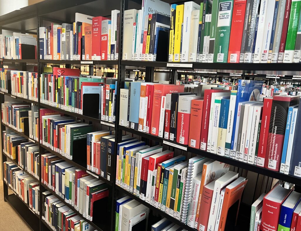 Der Bestand von aktuellen ausleihbaren Kommentaren und Fachbüchern in gedruckter Form oder auch als Fach-E-Book zum Download ist über das Suchportal Digibib findbar. Viele Meter Buch stehen im 2. Obergeschoss in der Gruppe R für die jeweils vierwöchige Ausleihe bereit.